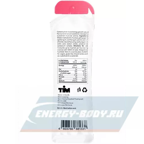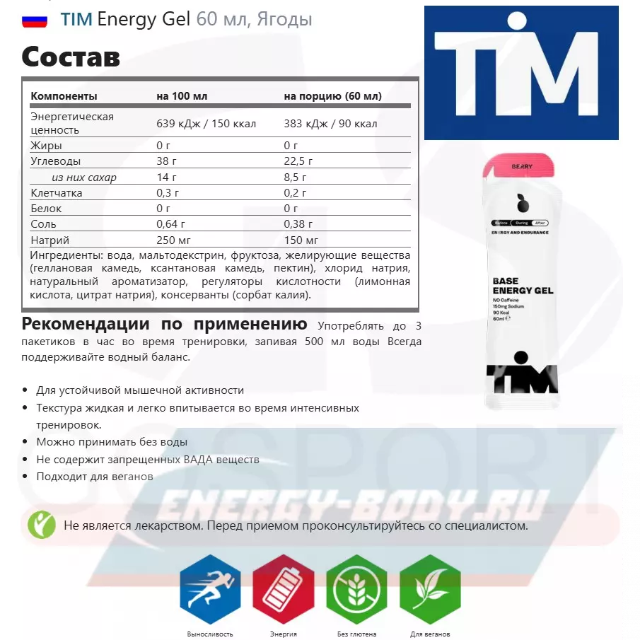 • Гель содержит 150 мг натрия и 22,5 г углеводов