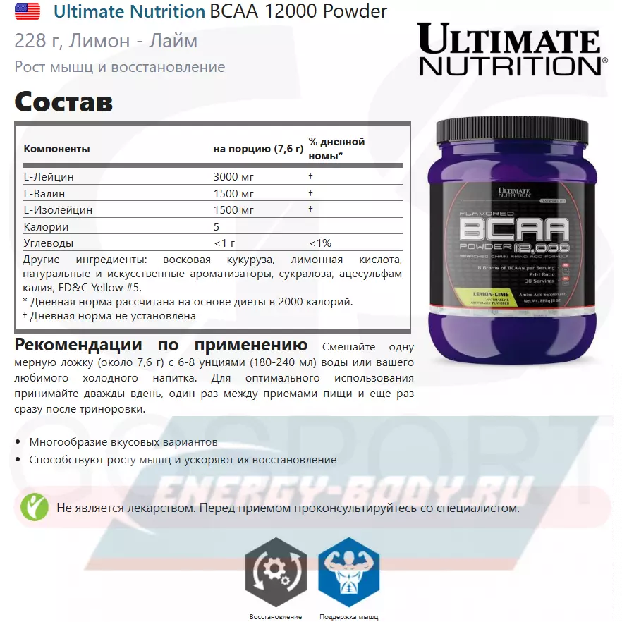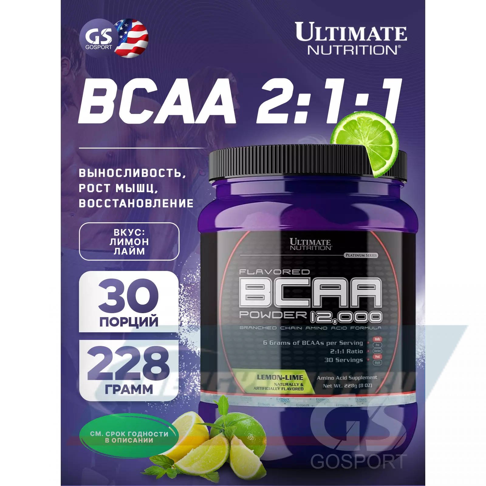 Ultimate Nutrition BCAA 12000 Powder 228 г, Лимон - Лайм — Выносливость и восстановления мышечных тканей