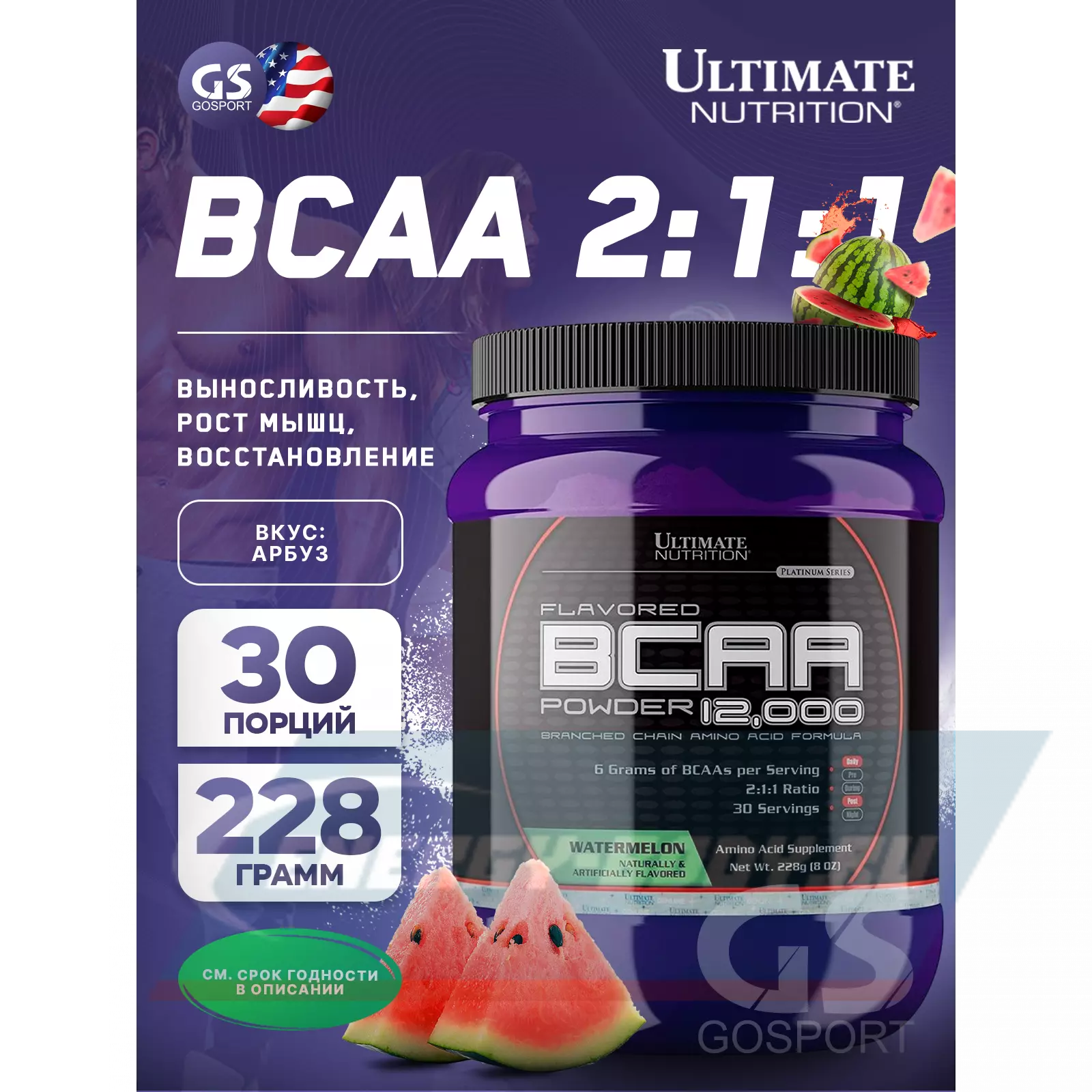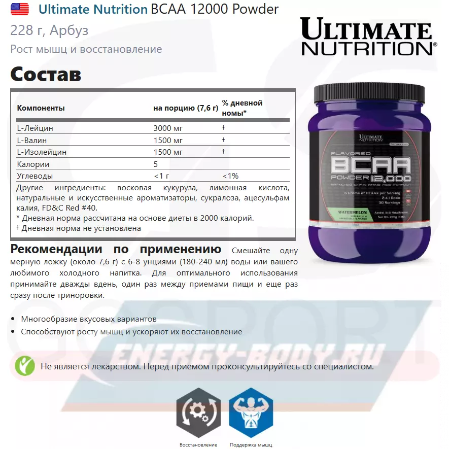 Ultimate Nutrition BCAA 12000 Powder 228 г, Арбуз — Выносливость и восстановления мышечных тканей