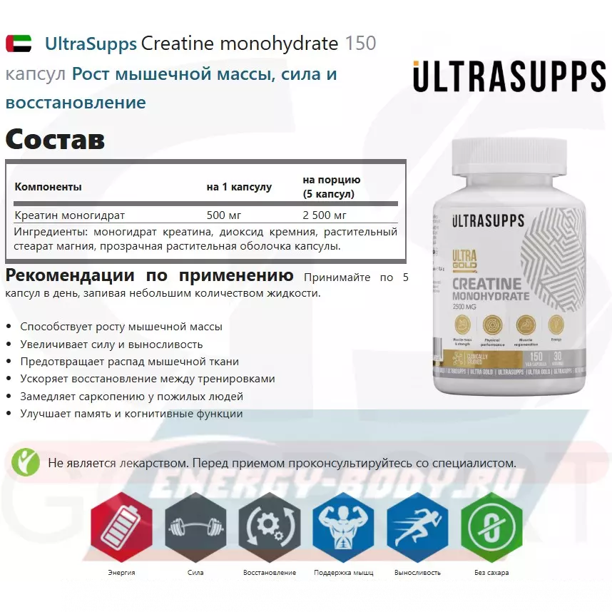 UltraSupps Creatine monohydrate 150 капсул — Рост мышечной массы, сила и восстановление
