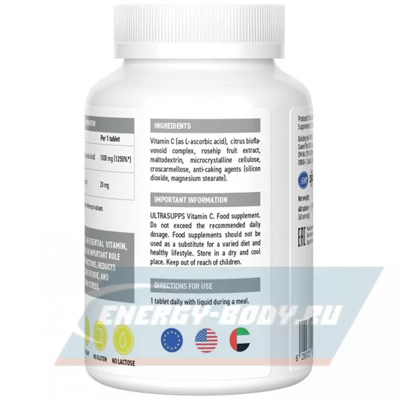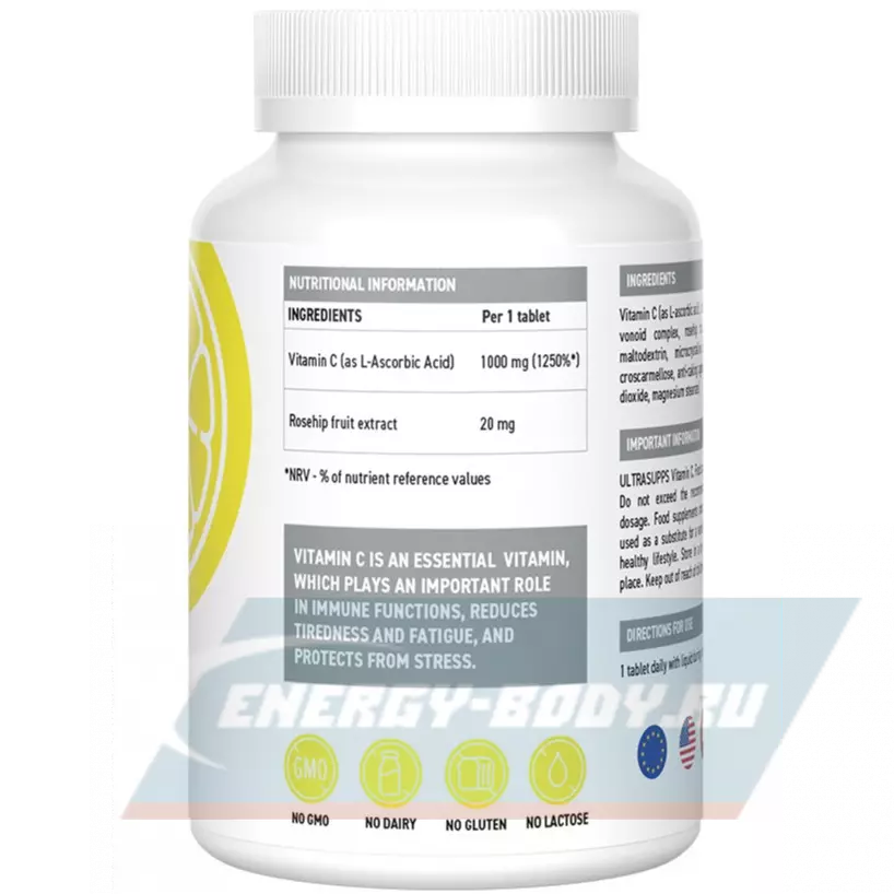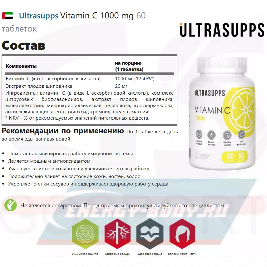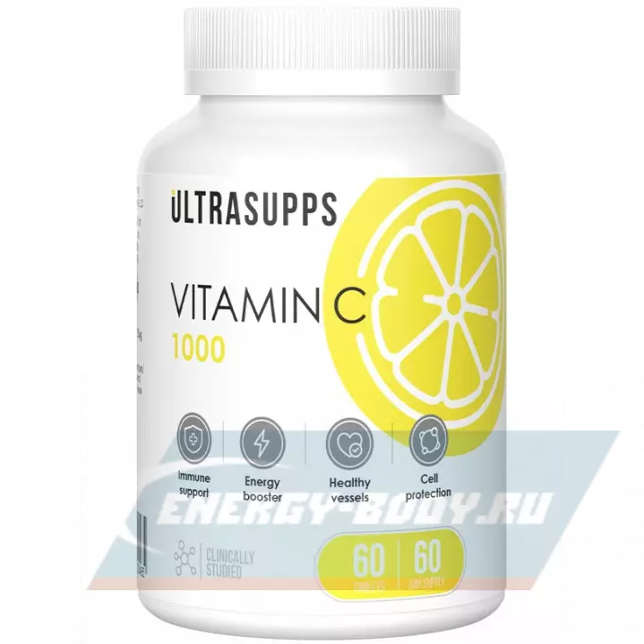 Ultrasupps Vitamin C – биоактивная добавка L-аскорбиновой кислоты с добавлением экстракта шиповника и цитрусовых биофлавоноидов. Витамин С важен для поддержания и укрепления иммунитета, он оказывает организму мощную поддержку в борьбе с вирусными и бактериальными инфекциями, способствует быстрому восстановлению после болезни. Цитрусовые биофлавоноиды в составе поддерживают здоровье сердца, сосудов, снимают воспаления, активизируют иммунитет, помогают витамину С лучше усваиваться и выполняют роль антиоксидантов. Антиоксиданты минимизируют влияние окислительных стрессов, предотвращая различные заболевания и сбои в работе организма. Экстракт плодов шиповника — источник витаминов А, В1, В2, В3, К. Так же как и Витамин С он подпитывает иммунную систему и способствует угасанию воспалений. Шиповник положительно влияет на здоровье кожи, замедляет процессы старения, нормализует работу почек.