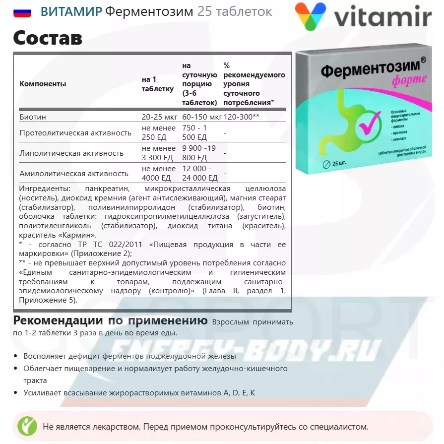 Ингредиенты: панкреатин, микрокристаллическая целлюлоза (носитель), диоксид кремния (агент антислеживающий), магния стеарат (стабилизатор), поливинилпирролидон (стабилизатор), биотин, оболочка таблетки: гидроксипропилметилцеллюлоза (загуститель), полиэтиленгликоль (стабилизатор), диоксид титана (краситель), краситель «Кармин».