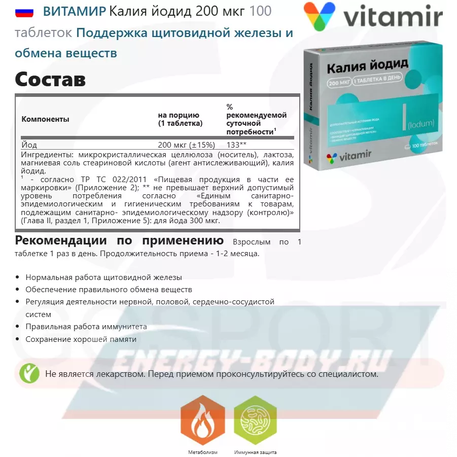 Йод участвует в синтезе гормонов щитовидной железы и важен для многих физиологических процессов в организме, в частности, способствует: