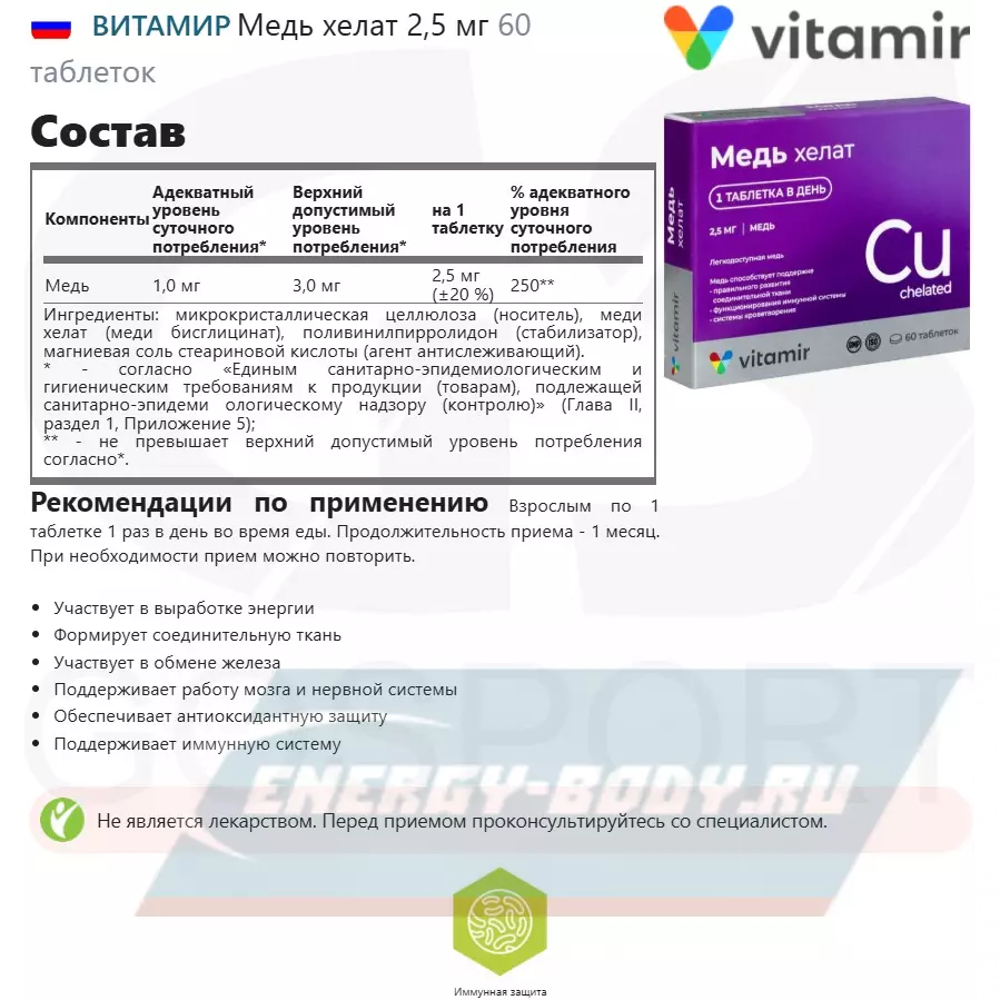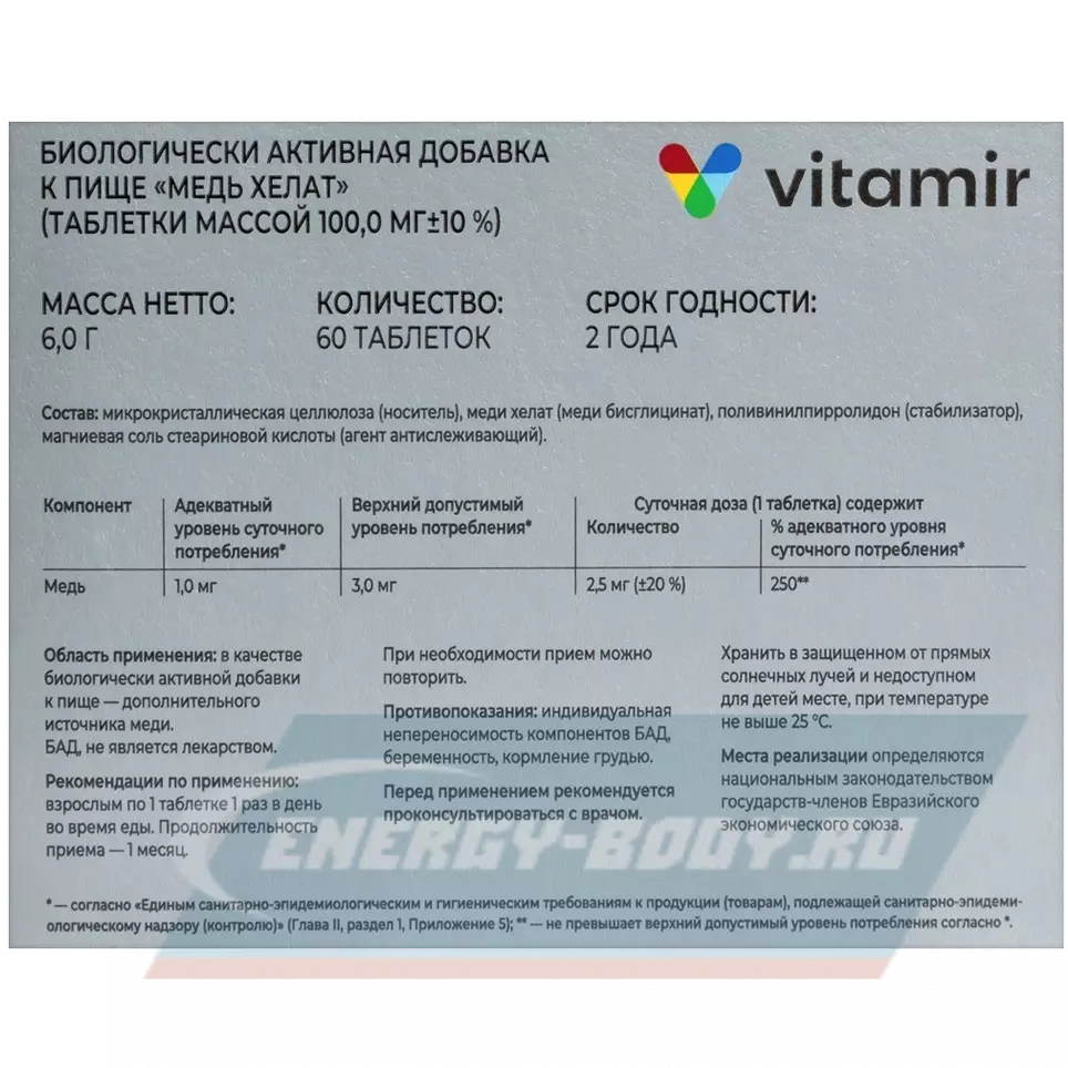 Состав ВИТАМИР Медь хелат 2,5 мг