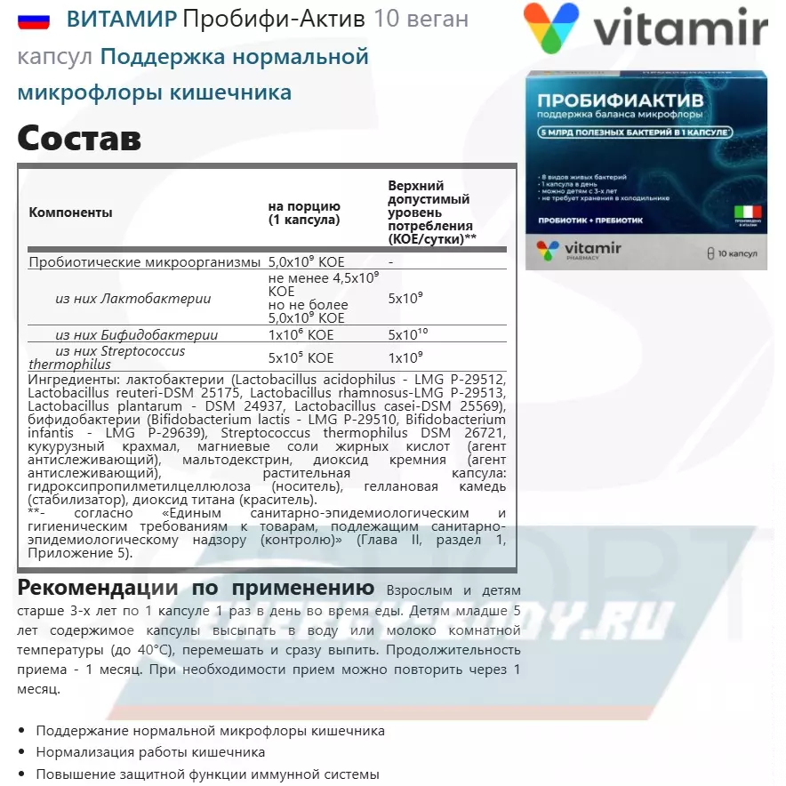 Ингредиенты: лактобактерии (Lactobacillus acidophilus - LMG P-29512, Lactobacillus reuteri-DSM 25175, Lactobacillus rhamnosus-LMG Р-29513, Lactobacillus plantarum - DSM 24937, Lactobacillus casei-DSM 25569), бифидобактерии (Bifidobacterium lactis - LMG P-29510, Bifidobacterium infantis - LMG P-29639), Streptococcus thermophilus DSM 26721, кукурузный крахмал, магниевые соли жирных кислот (агент антислеживающий), мальтодекстрин, диоксид кремния (агент антислеживающий), растительная капсула: гидроксипропилметилцеллюлоза (носитель), геллановая камедь (стабилизатор), диоксид титана (краситель).
