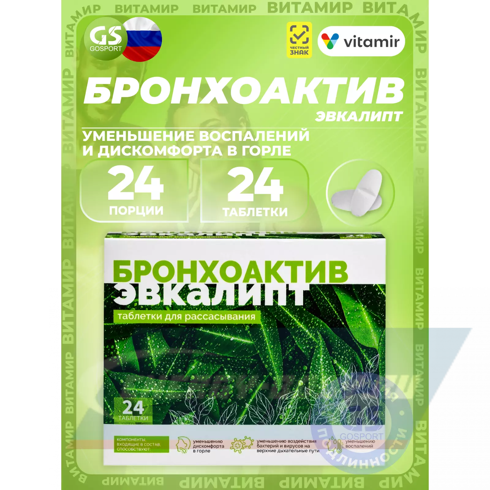 ВИТАМИР Бронхоактив Эвкалипт 24 таблетки — Уменьшение дискомфорта в горле и воспалений