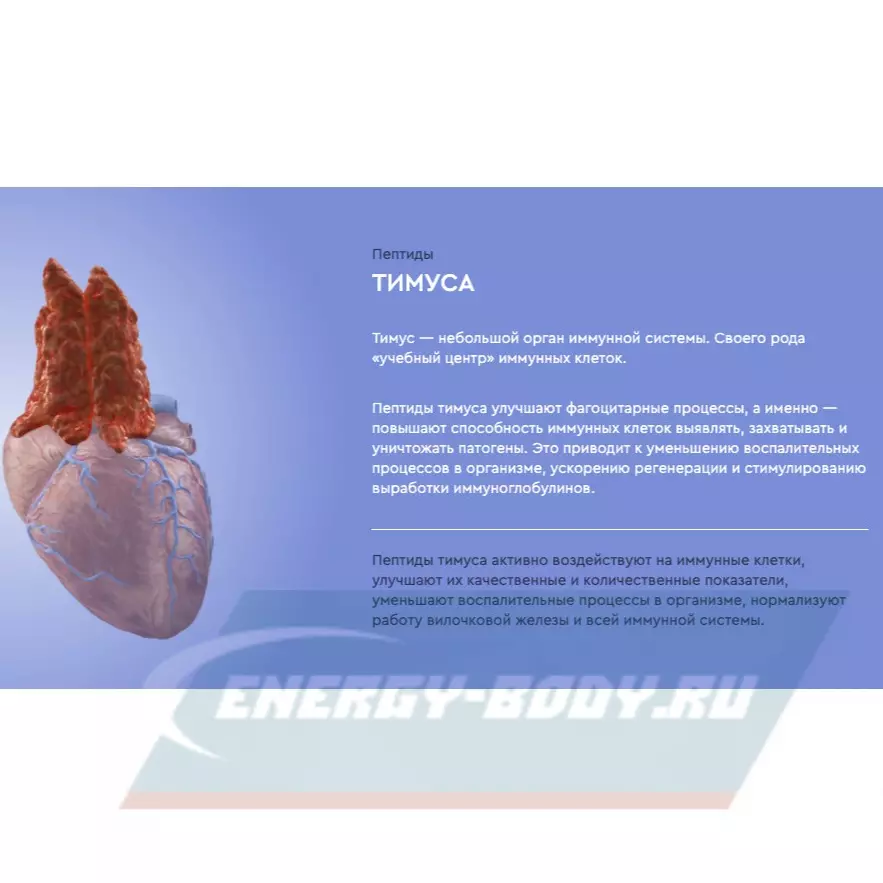 - Важнейший орган иммунной системы - тимус. Пептиды тимуса улучшают его функциональные возможности, благодаря чему большое количество Т-лимфоцитов приобретает рецепторы, которые помогают различать чужеродные белки, микроорганизмы и поврежденные клетки. Это в разы повышает иммунный ответ.