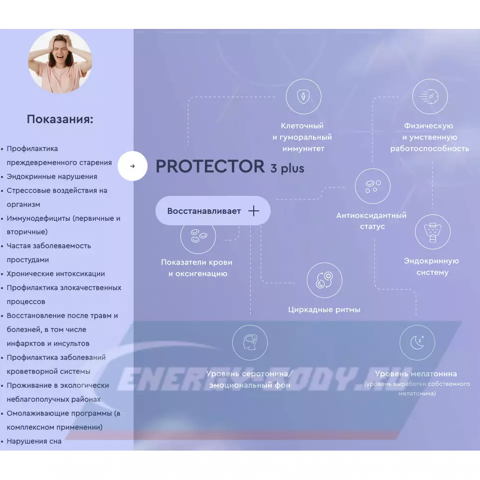 «Протектор 3 Плюс» – это натуральное средство, которое обладает поддерживающим иммунитет действием благодаря своему влиянию на синтез мелатонина и других веществ, участвующих в адаптационных процессах организма.