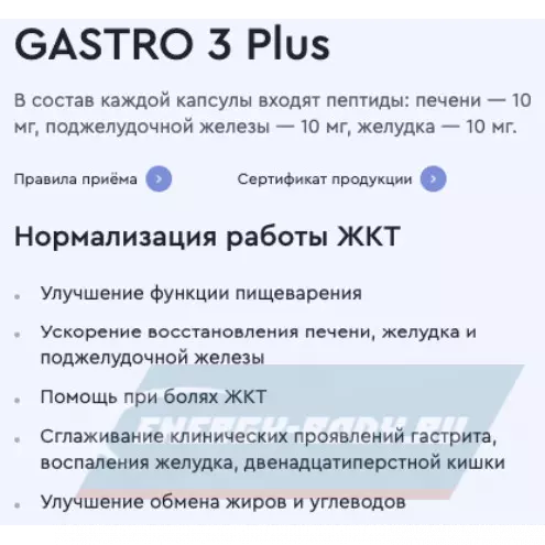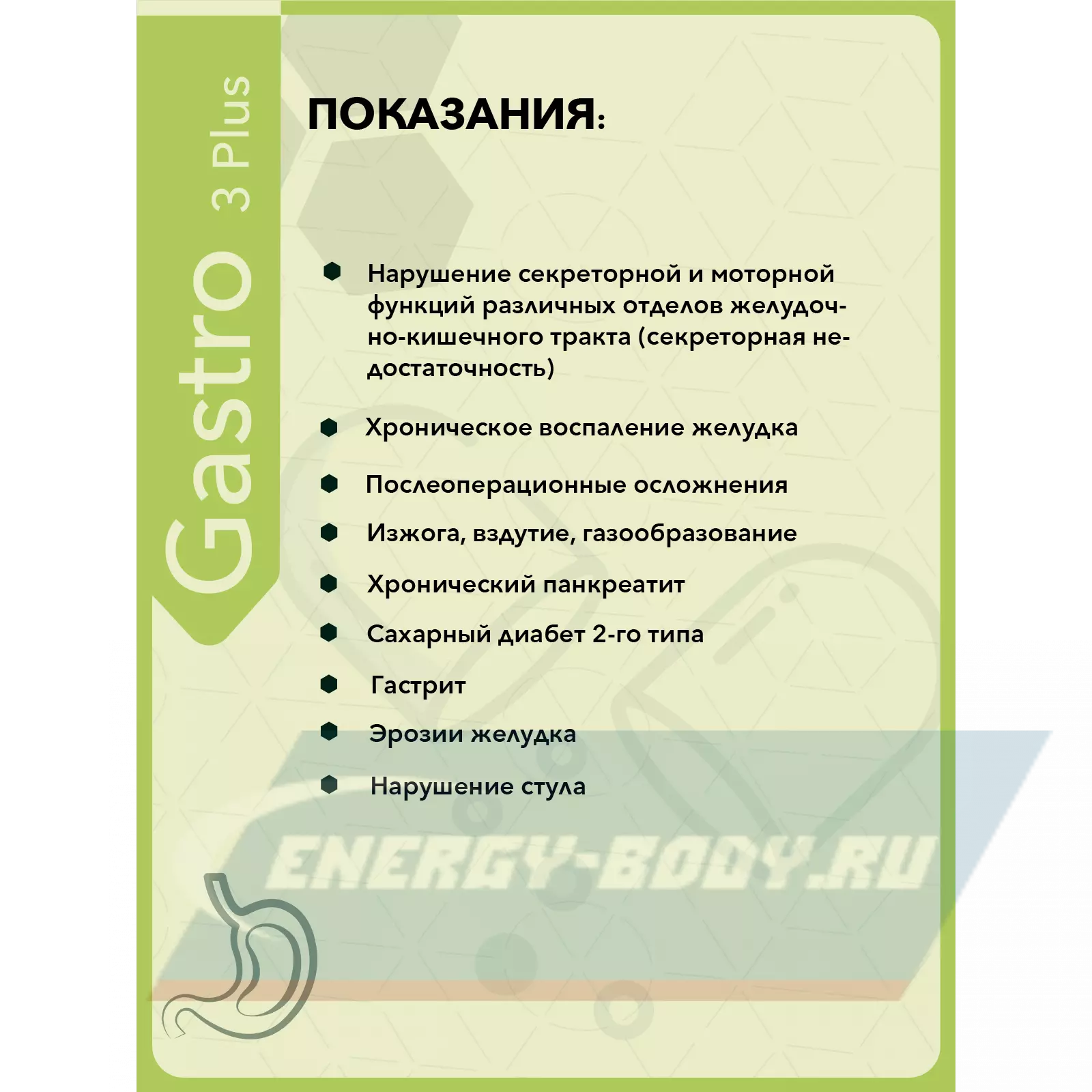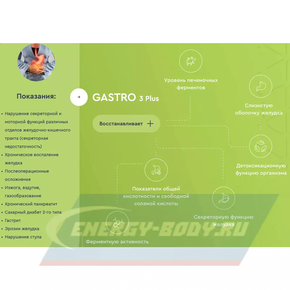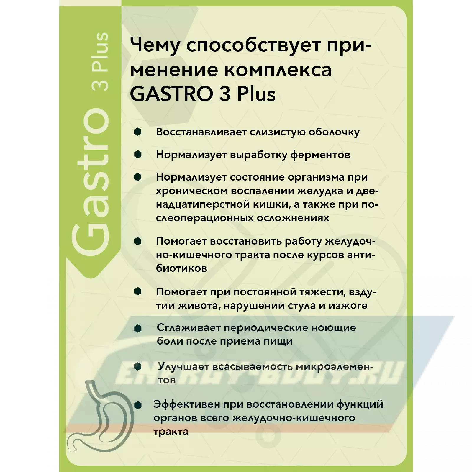 Состав комплекса «Гастро 3 Плюс» подобран таким образом, чтобы регулировать работу желез пищеварительного тракта и поддерживать бесперебойную работу ЖКТ. Биорегуляторы ускоряют восстановление клеток печени, желудка и поджелудочной железы, которые могут возникать при стрессе, погрешностях в питании или под влиянием других негативных факторов.
