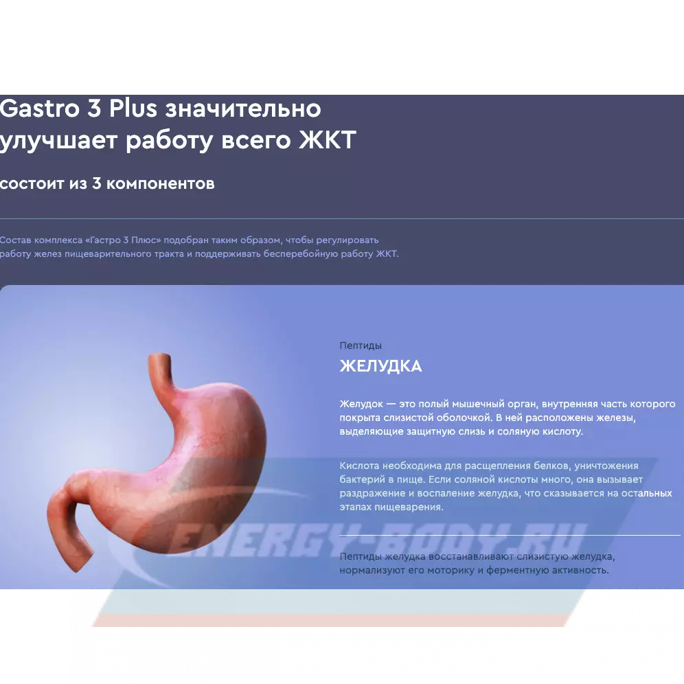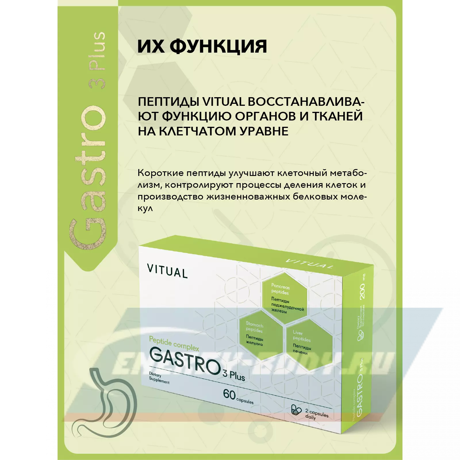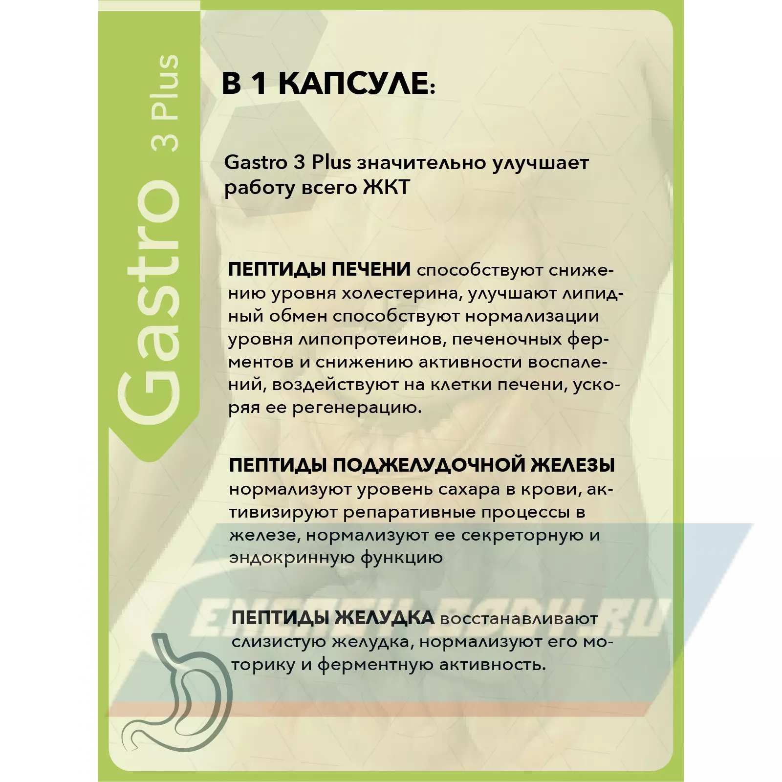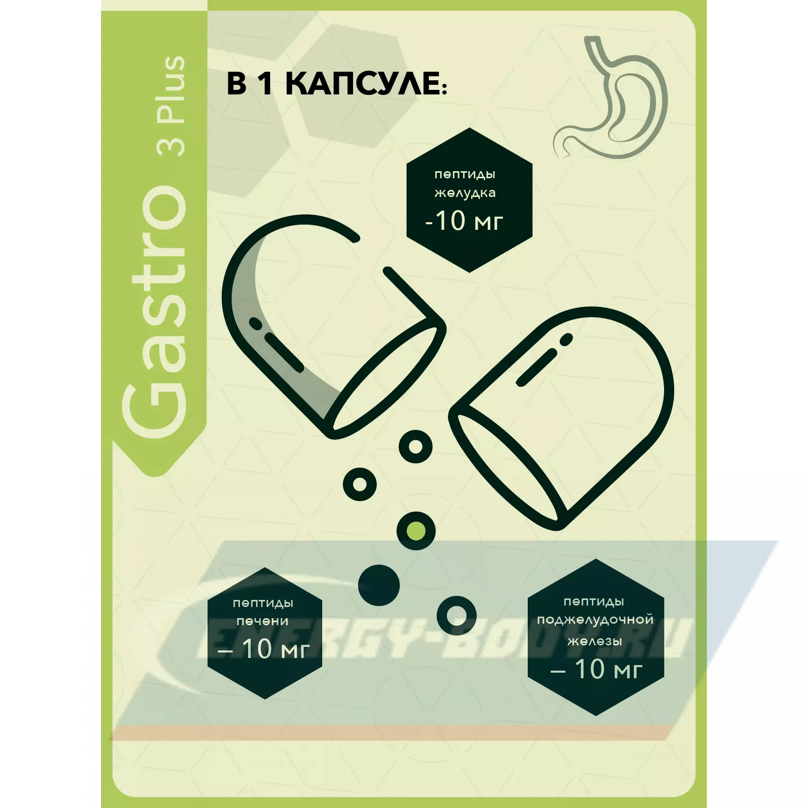Состав комплекса «Гастро 3 Плюс» подобран таким образом, чтобы регулировать работу желез пищеварительного тракта, улучшать функцию пищеварения, ускорять восстановление после проблем с желудочно-кишечным трактом. Использование регуляторных пептидов эффективно для поддержания бесперебойной работы ЖКТ, профилактики дискомфорта, который вызван стрессом или длительным приемом различных средств.