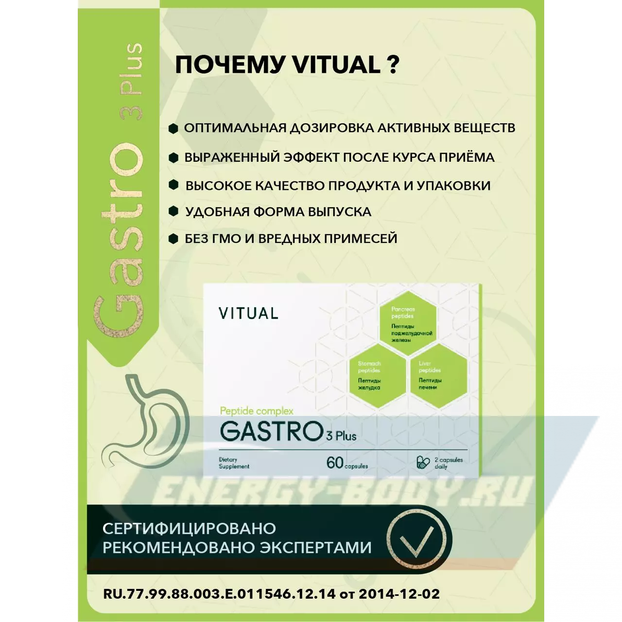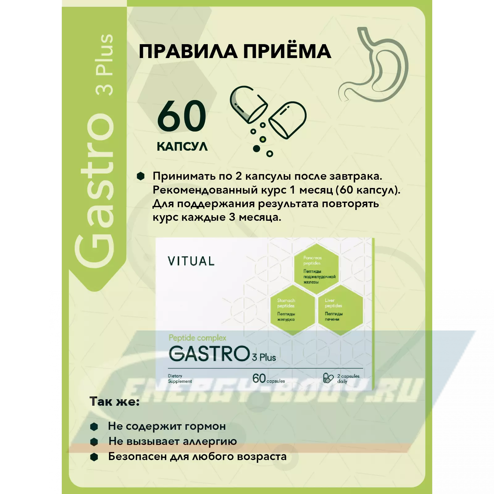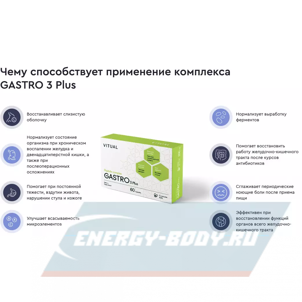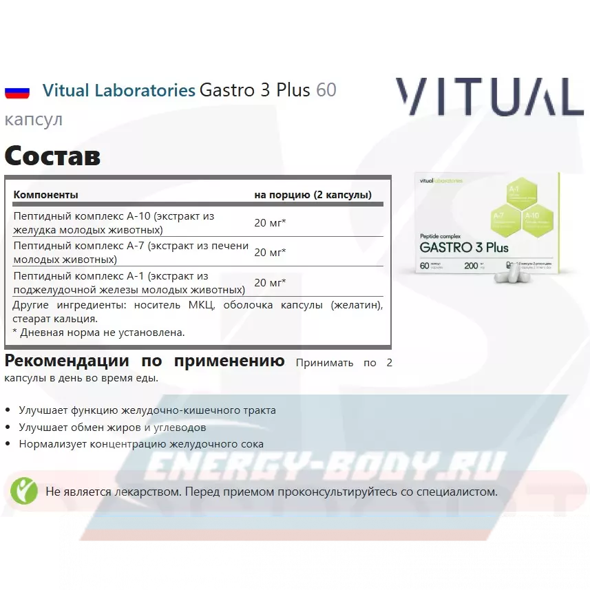 Состав комплекса «Гастро 3 Плюс» подобран таким образом, чтобы регулировать работу желез пищеварительного тракта, улучшать функцию пищеварения, ускорять восстановление после проблем с желудочно-кишечным трактом. Использование регуляторных пептидов эффективно для поддержания бесперебойной работы ЖКТ, профилактики дискомфорта, который вызван стрессом или длительным приемом различных средств.