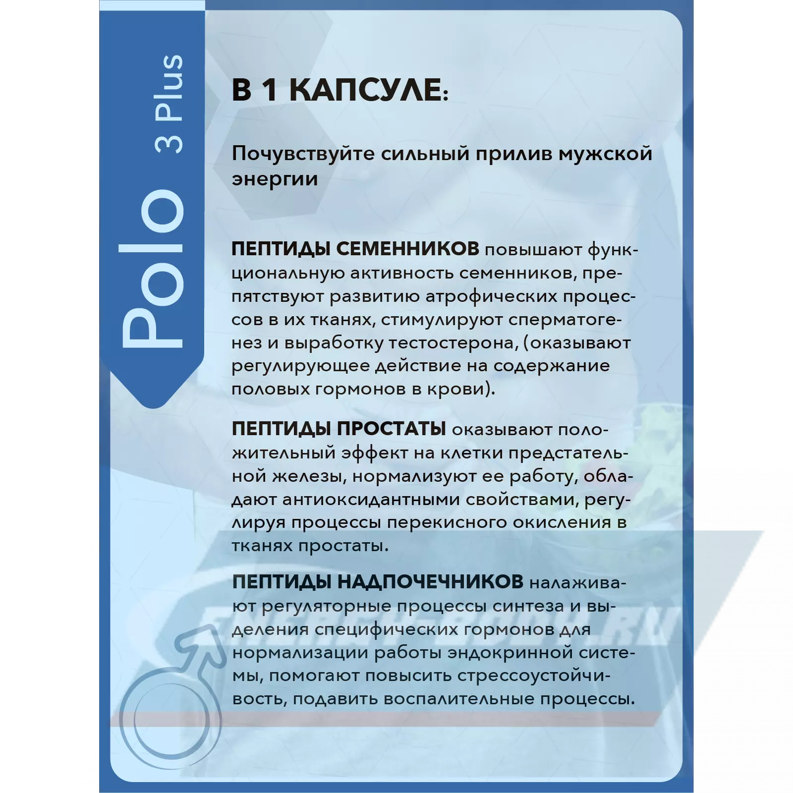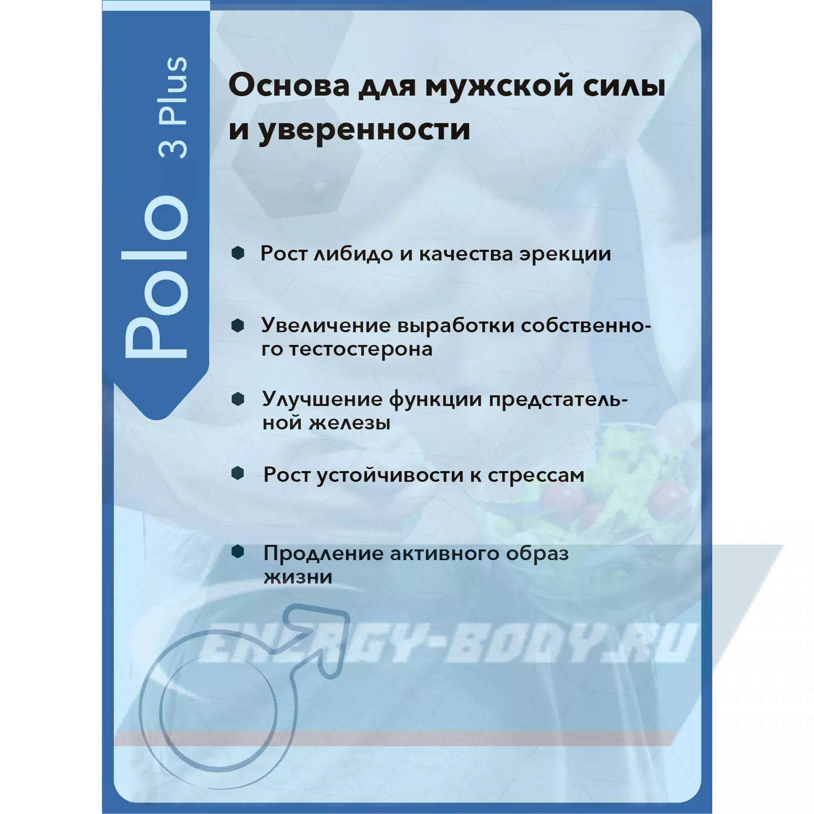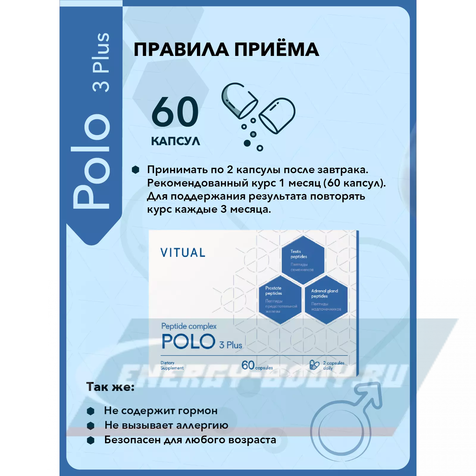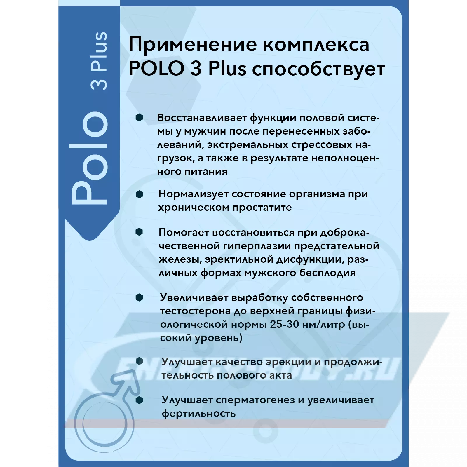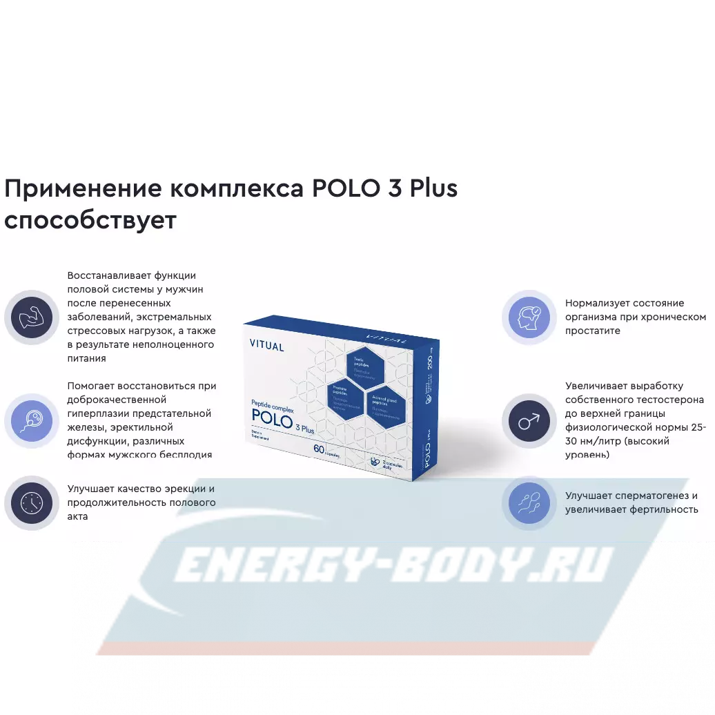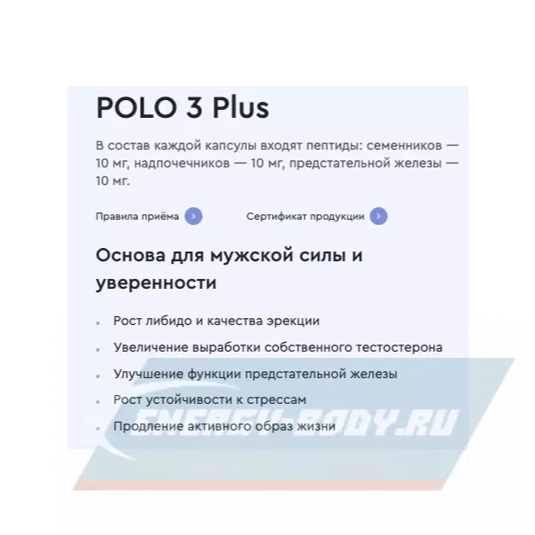 «Поло 3 Плюс» рекомендуется применять мужчинам любого возраста для увеличения выработки собственного тестостерона, улучшения функции предстательной железы, увеличения устойчивости к стрессам, продления активного образа жизни и замедления негативных процессов, свойственных для мужчин как среднего, так и старшего возраста.