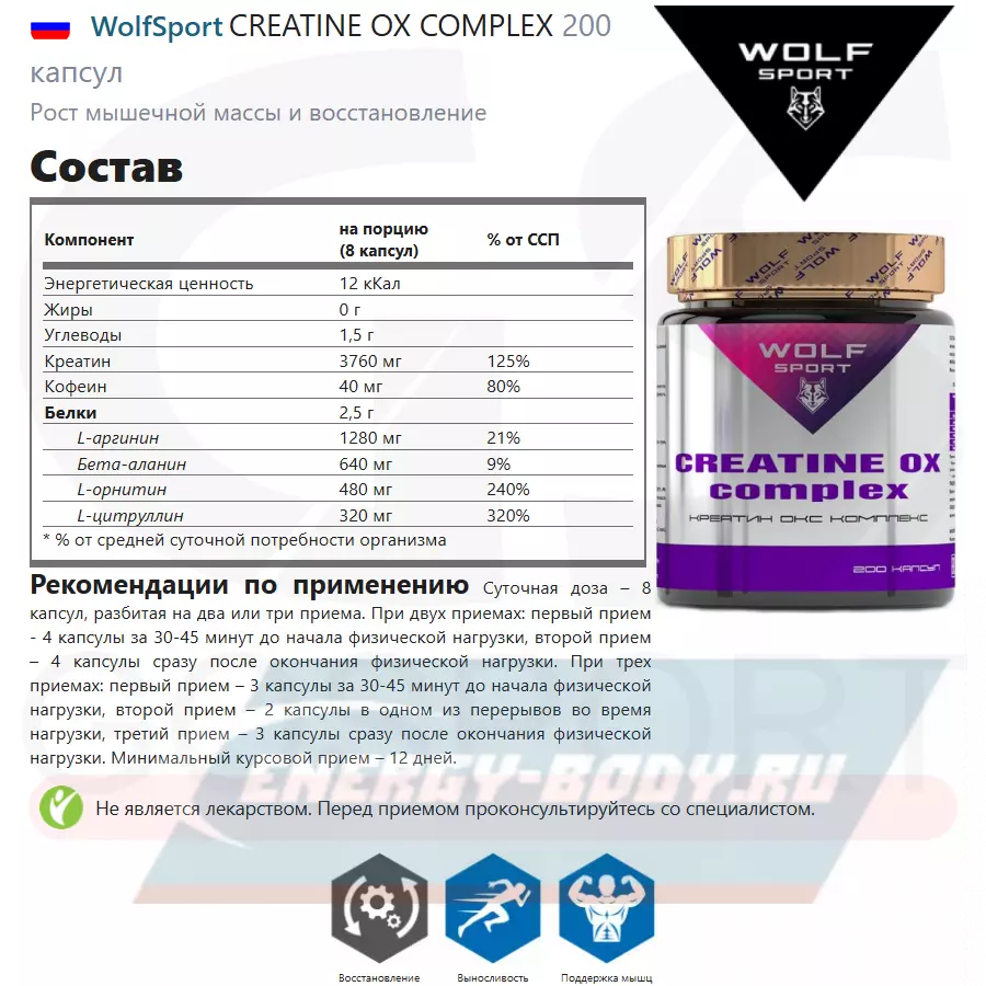 Специализированный креатин-содержащий комплекс для спортсменов – сочетание трех активных форм креатина (этилово-эфирный, гидрохлорид и моногидрат), усиленных компонентами системы оксида азота для легкого вхождения в нагрузки