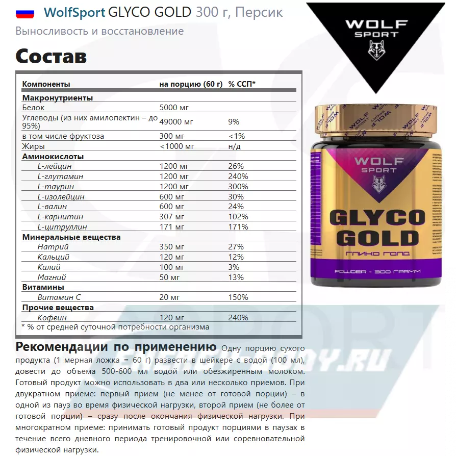 Одну порцию сухого продукта (1 мерная ложка = 60 г) развести WOLFSPORT Продукты для профессиональных спортсменов в шейкере с водой (100 мл), довести до объема 500-600 мл водой или обезжиренным молоком.