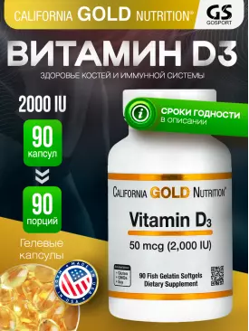 Витамин D Vitamin D3 50 mcg 2000 IU 90 капсул California Gold Nutrition Подписка на товар Артикул 37120