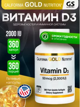 Витамин D Vitamin D3 50 mcg 2000 IU 360 желатиновых капсул California Gold Nutrition Подписка на товар Артикул 37661