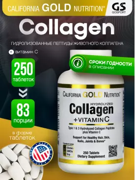 COLLAGEN Hydrolyzed Collagen Peptides + Vitamin C, Type I III 250 таблеток California Gold Nutrition Подписка на товар Артикул 37656