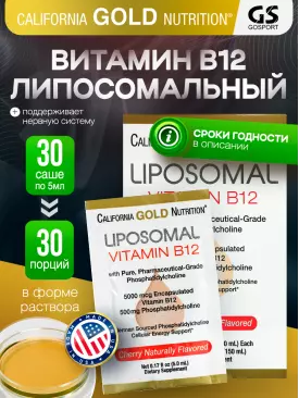 Витамины группы B Liposomal Vitamin B12 30 пакетиков х 5 мл, вишня California Gold Nutrition Подписка на товар Артикул 37075