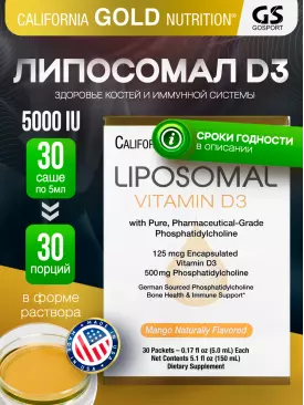 Витамин D Liposomal Vitamin D3 125 mcg (5000 IU) 30 пакетиков х 5 мл, манго California Gold Nutrition Подписка на товар Артикул 37078