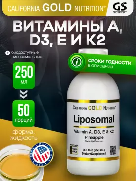 Витаминный комплекс Liposomal Vitamin A, D3, E & K2, Pineapple Flavor 250 мл, ананас California Gold Nutrition Подписка на товар Артикул 37079