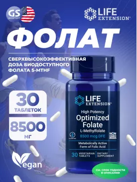 Витамины группы B High Potency Optimized Folate 8500 mcg DFE 30 таблеток Life Extension Подписка на товар Артикул 37245