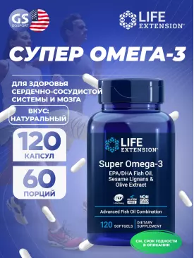 Omega 3 Super Omega-3 EPA/DHA Fish Oil, Sesame Lignans & Olive Extract 120 капсул Life Extension Подписка на товар Артикул 37243