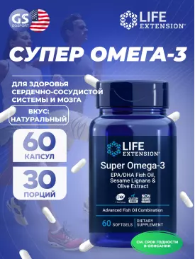 Omega 3 Super Omega-3 EPA/DHA Fish Oil, Sesame Lignans & Olive Extract 60 капсул Life Extension Подписка на товар Артикул 37242