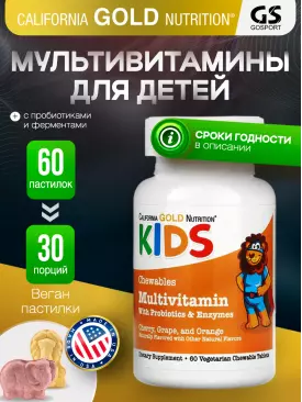 Витамины для детей Chewable Multivitamins with Probiotics & Enzymes for Children, Assorted F 60 вегетарианские пастилки California Gold Nutrition Подписка на товар Артикул 38713