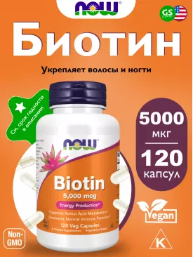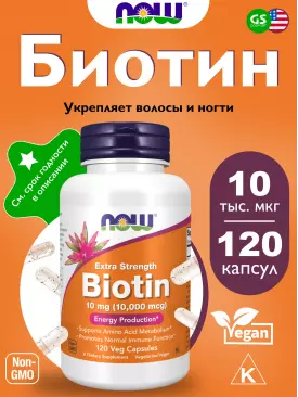Витамины группы B Extra Strength Biotin 10 mg (10.000 mcg) 120 веган капсул NOW FOODS Подписка на товар Артикул 39922