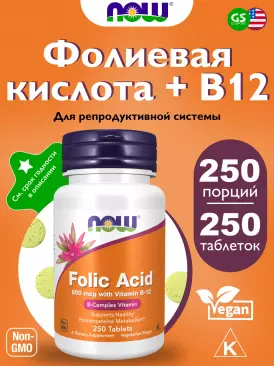 Витамины группы B Folic Acid 800 mcg + B-12 (Cyanocobalamin) 25 mcg 250 таблеток NOW FOODS Подписка на товар Артикул 40123