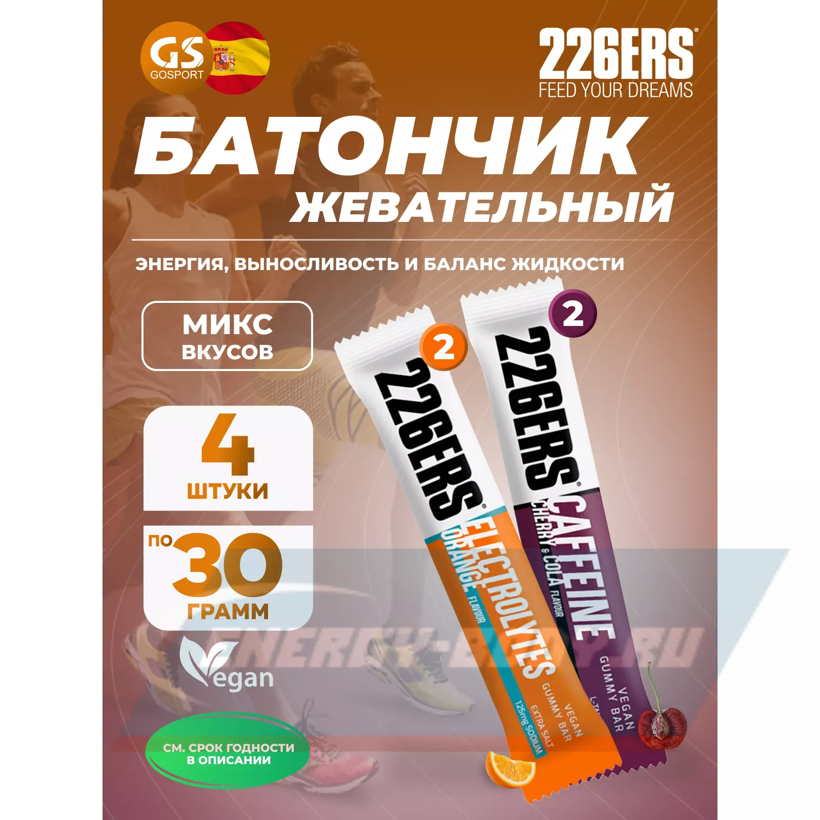 226ERS Gummy bar + sodium 125 mg 4 x 30 г, Микс 3 — Энергия и выносливость