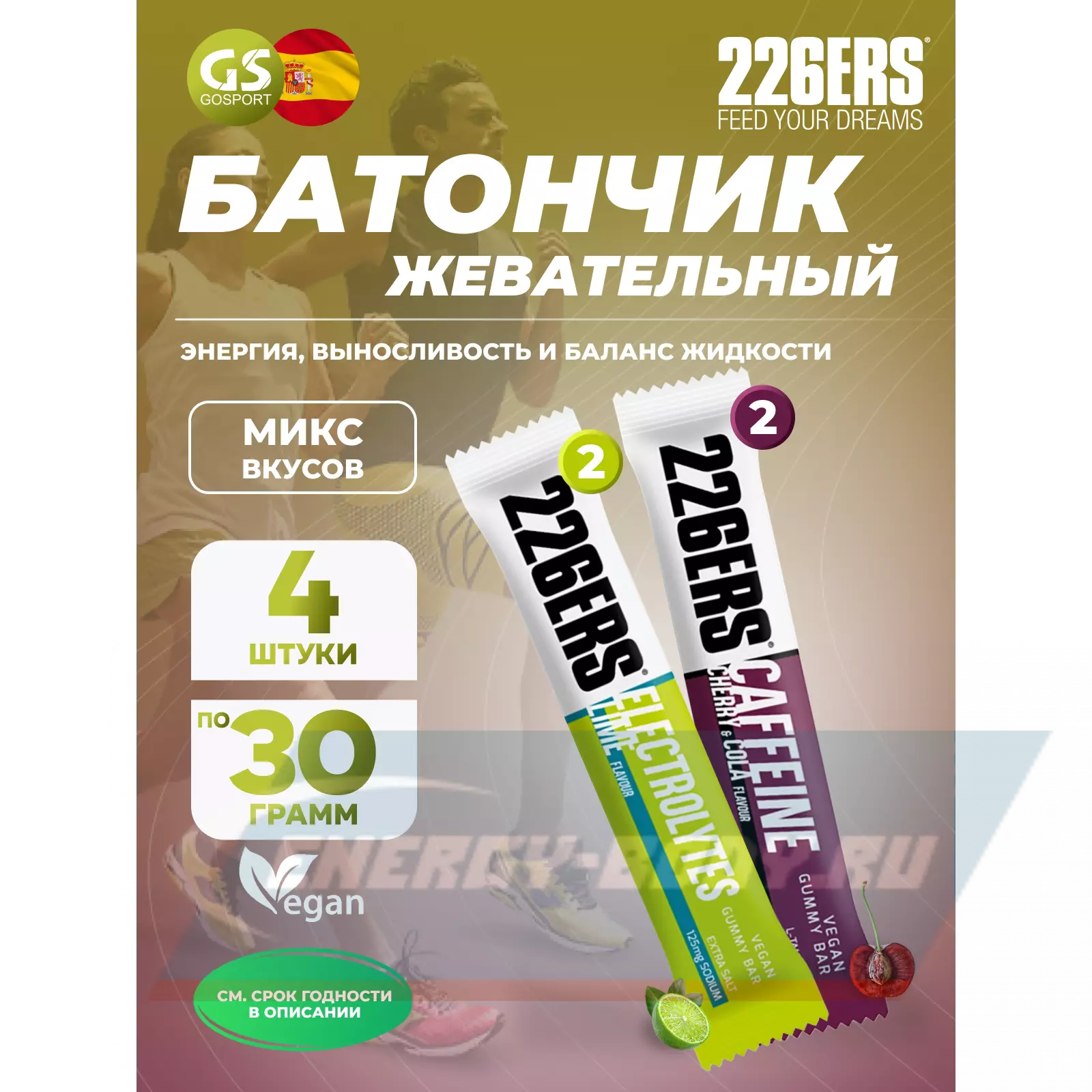 226ERS Gummy bar + sodium 125 mg 4 x 30 г, Микс 4 — Энергия и выносливость
