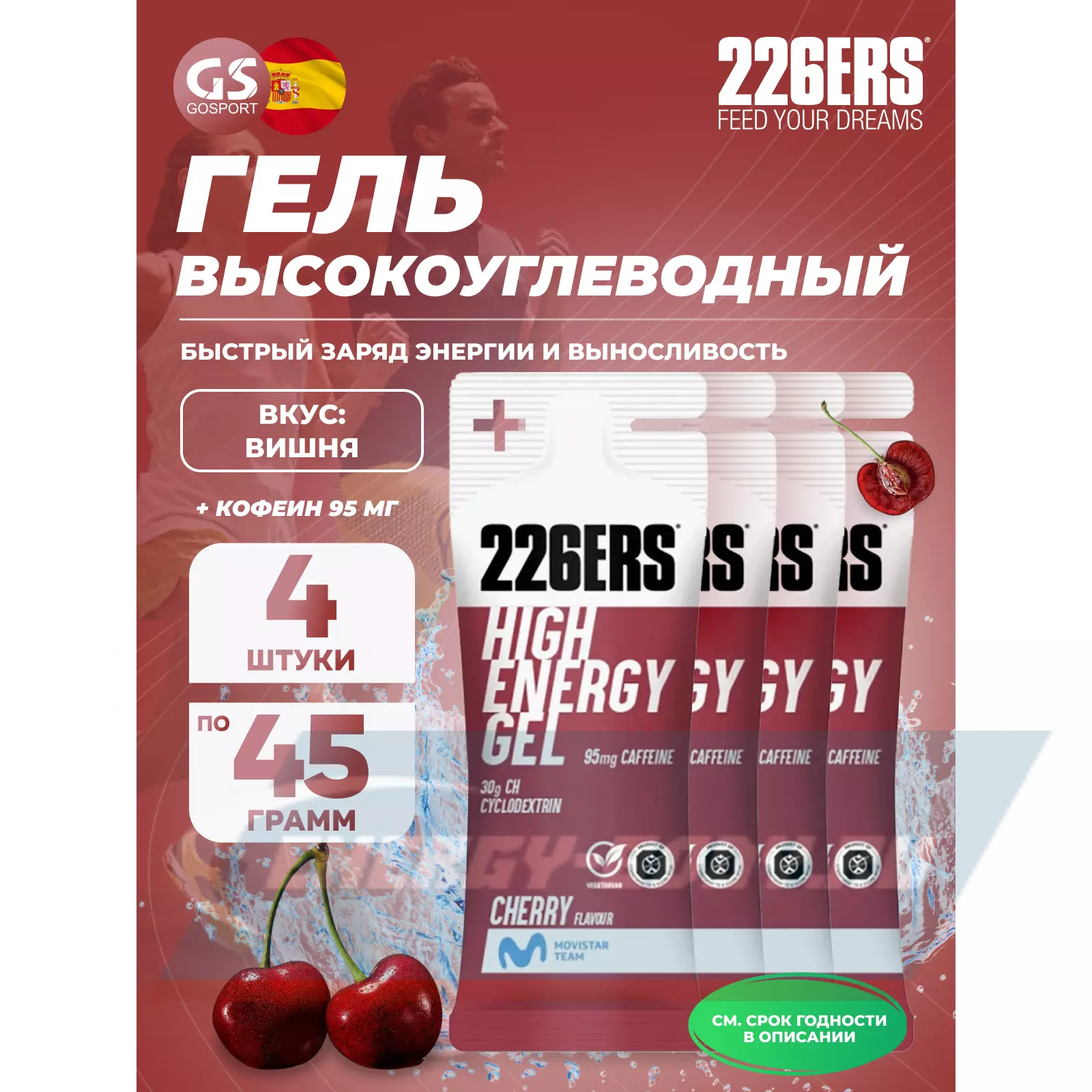 226ERS High Energy Gel + caffeine 95 mg 4 x 45 г, Вишня — Быстрый заряд энергии и выносливость