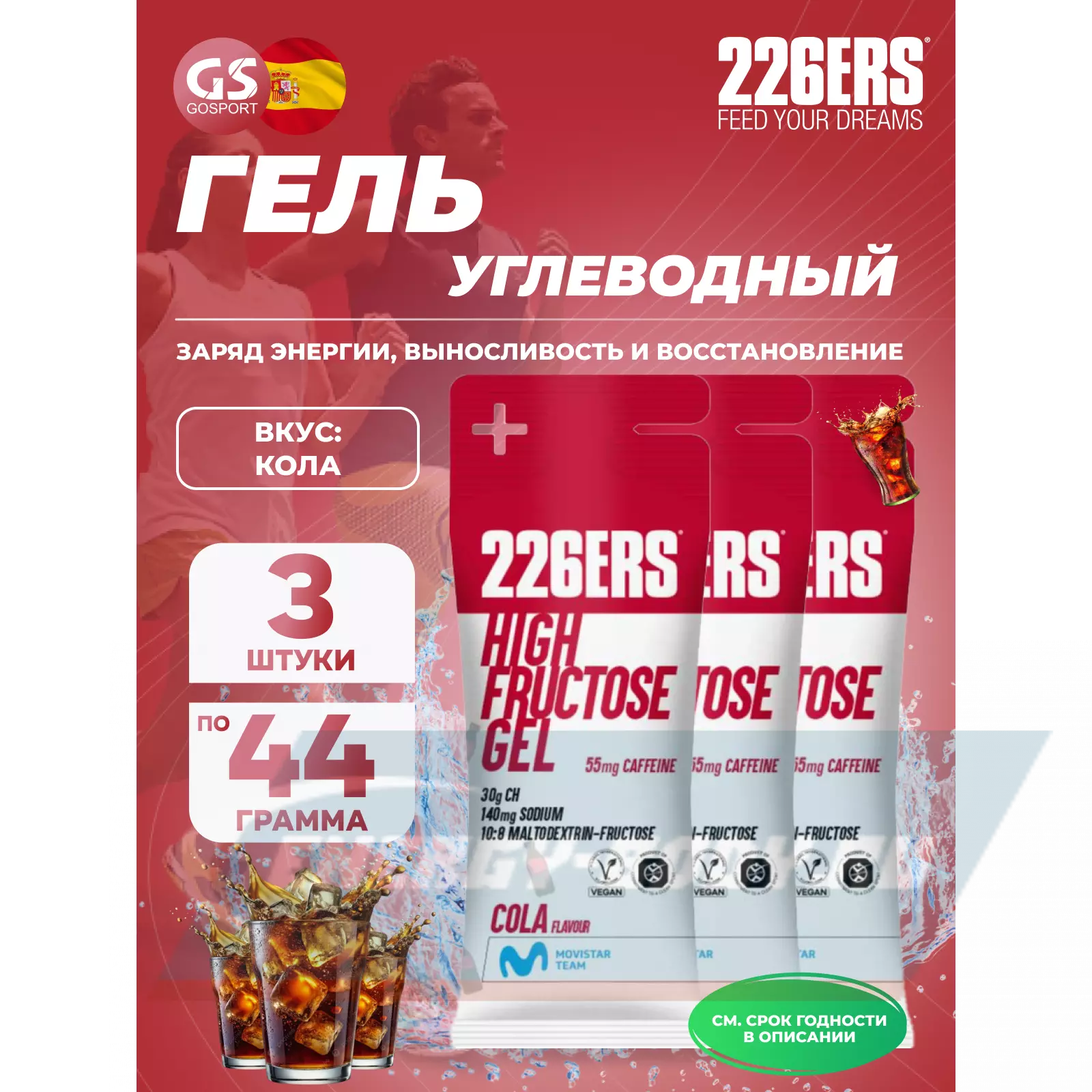 226ERS High Fructose Gel 250 mg + caffeine 55 mg 3 x 44 г, Кола — Быстрый заряд энергии и выносливость
