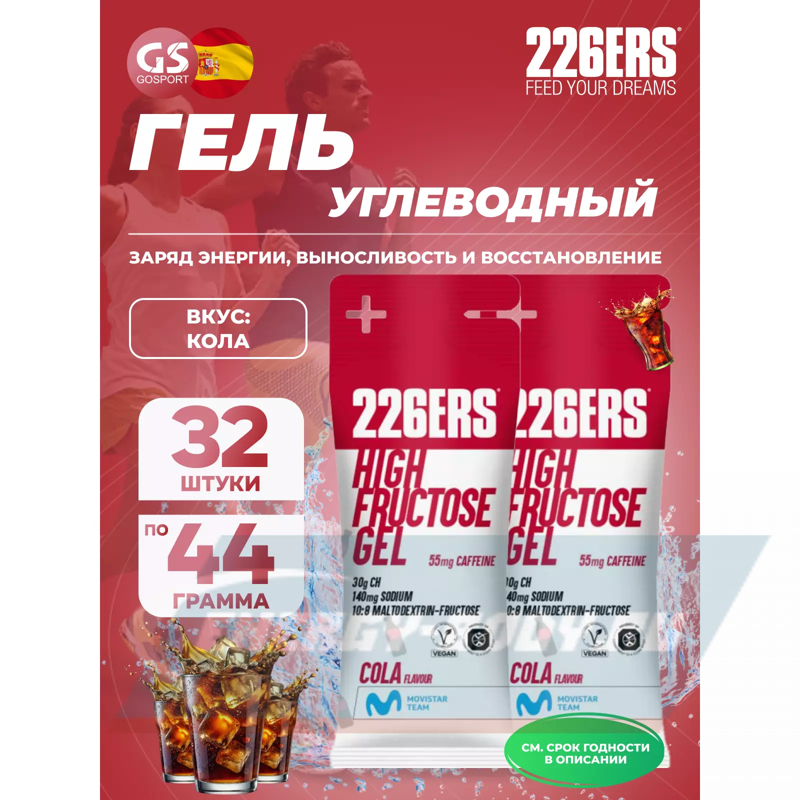 226ERS High Fructose Gel 250 mg + caffeine 55 mg 32 x 44 г, Кола — Быстрый заряд энергии и выносливость