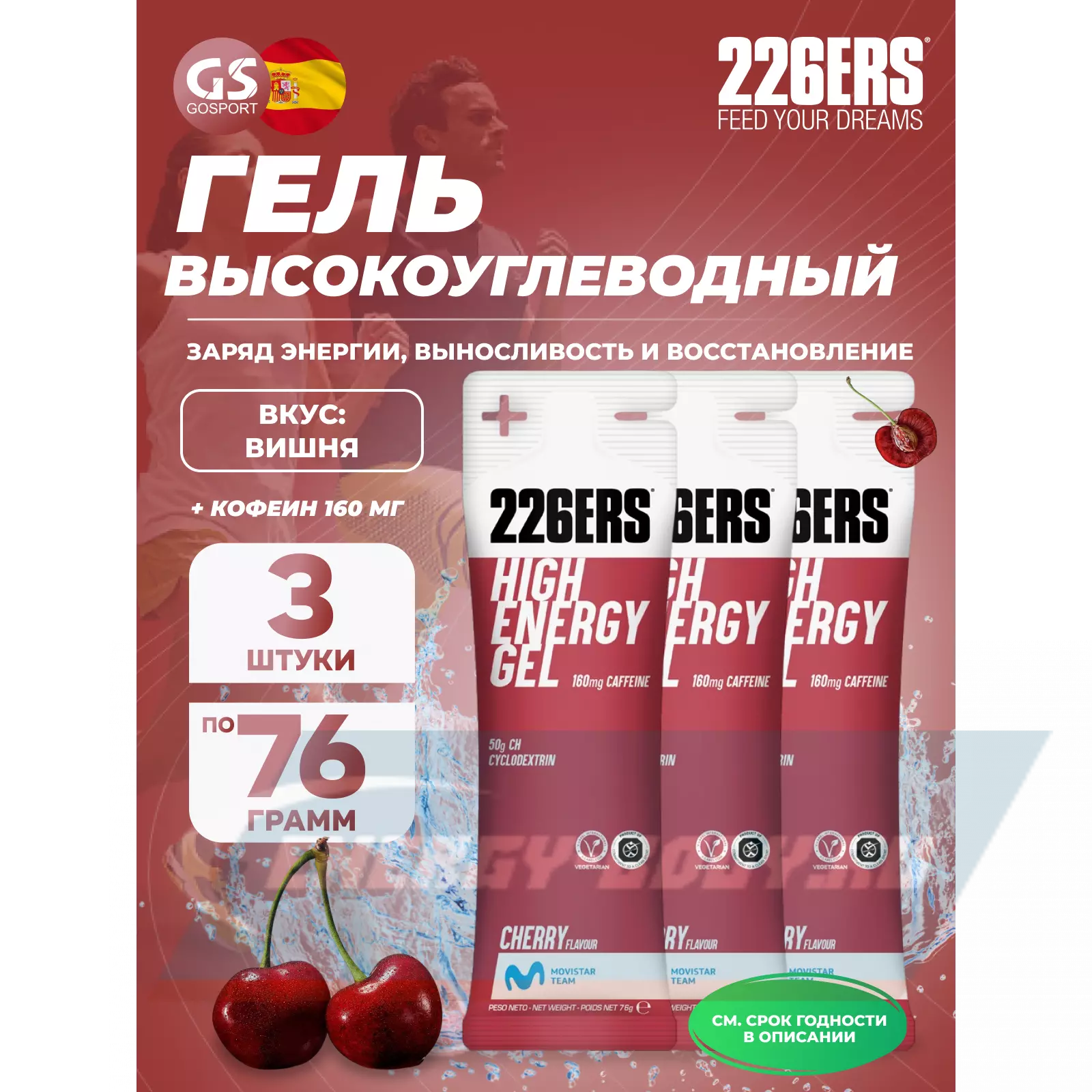 226ERS High Energy Gel + caffeine 160 mg 3 x 76 г, Вишня — Заряд энергии и повышение выносливости