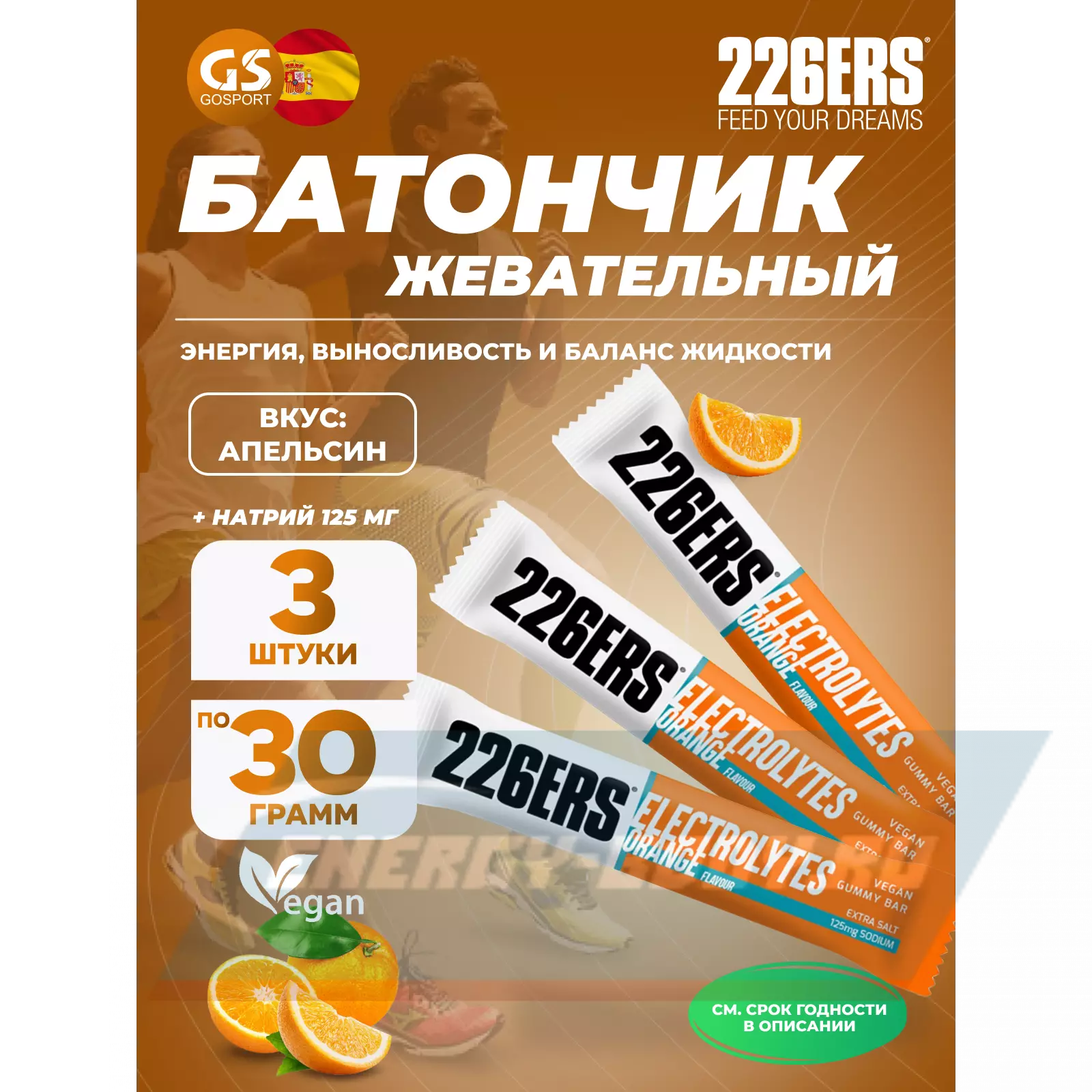 226ERS Gummy bar + sodium 125 mg 3 x 30 г, Апельсин — Энергия и выносливость