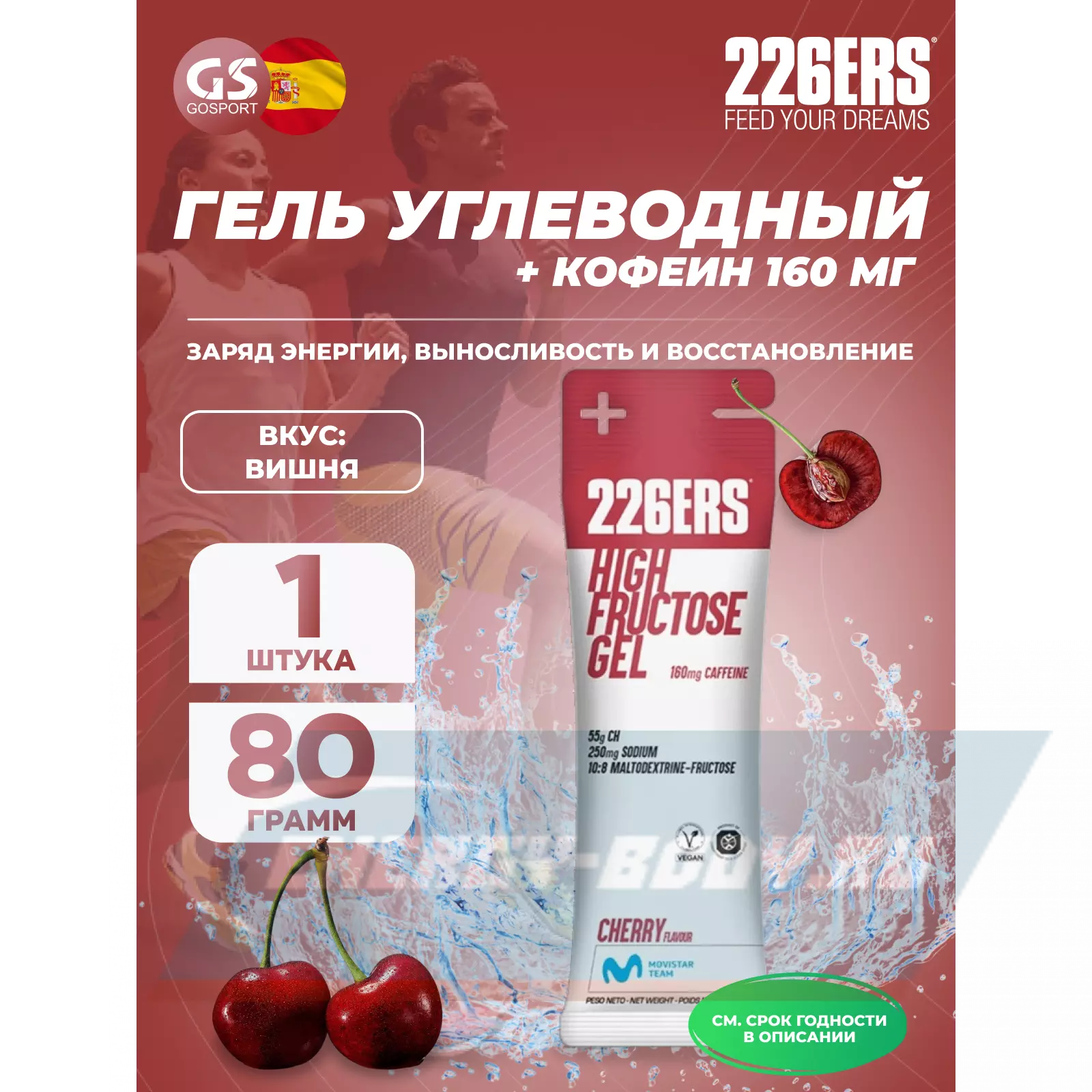 226ERS High Fructose Gel 250 mg + caffeine 160 mg 80 г, Черешня — Заряд энергии и выносливость