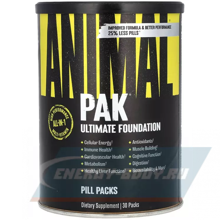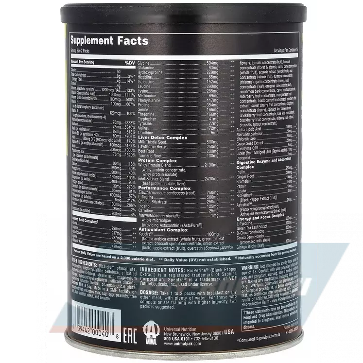 Недостаток тех или иных питательных веществ влияет не только на производительность и размер мышц, но и на эффективность других добавок. А для полноценной тренировки вам необходим «полный привод». Например, многим веществам для полноценного усвоения необходимы энзимы. Плохое питание означает плохую конверсию и активацию дорогостоящих добавок. Animal Pak — ваш страховой полис от подобных проблем.