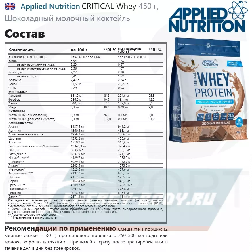 Applied Nutrition CRITICAL Whey содержит белок, полученый от коров, питающихся травой. Critical Whey Protein не содержит глютена, сертифицирован как халяль, содержит мало сахара и может стать отличным на вкус коктейлем — просто добавьте его в воду или обезжиренное молоко.