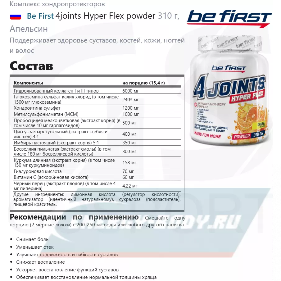 Be First 4joints Hyper Flex powder 310 г, Апельсин — Поддерживает здоровье суставов, костей, кожи, ногтей и волос