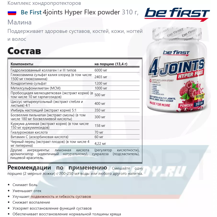 Be First 4joints Hyper Flex powder 310 г, Малина — Поддерживает здоровье суставов, костей, кожи, ногтей и волос