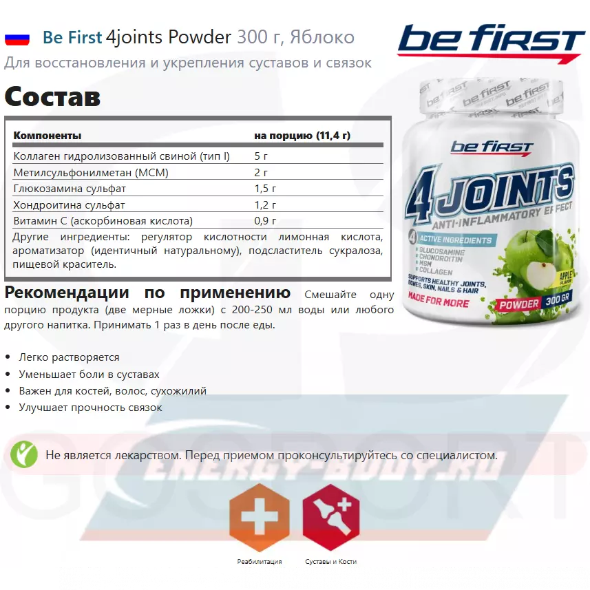Be First 4joints Powder 300 г, Яблоко — Для восстановления и укрепления суставов и связок