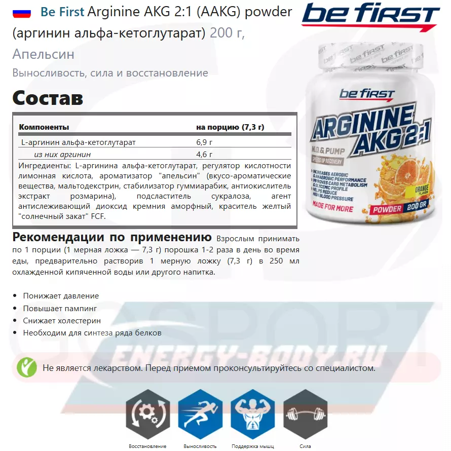 Be First AAKG 2:1 содержит аргинин в эффективной форме ААКГ – аргинин, связанный с альфа-кетоглютаратом (солью одноименной кислоты). Это повышает степень усвоения аргинина в кишечнике, и это важно, поскольку аргинин в принципе не слишком хорошо усваивается в пищеварительном тракте.