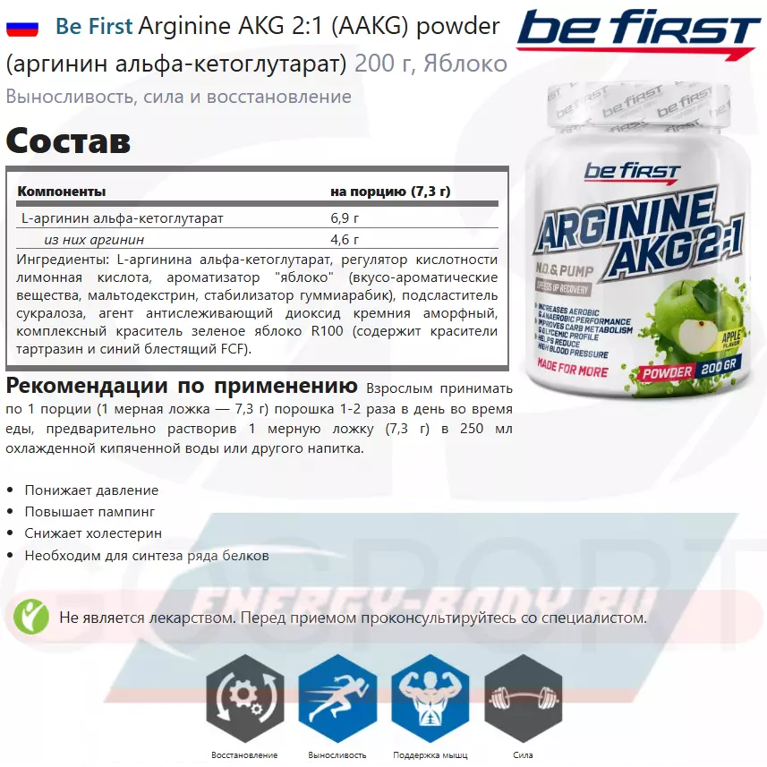 Be First AAKG 2:1 содержит аргинин в эффективной форме ААКГ – аргинин, связанный с альфа-кетоглютаратом (солью одноименной кислоты). Это повышает степень усвоения аргинина в кишечнике, и это важно, поскольку аргинин в принципе не слишком хорошо усваивается в пищеварительном тракте.