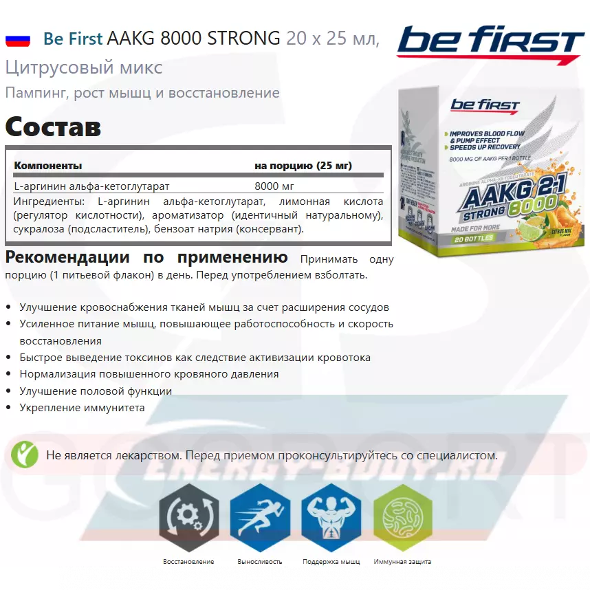 Be First AAKG 8000 STRONG 20 x 25 мл, Цитрусовый микс — Пампинг, рост мышц и восстановление