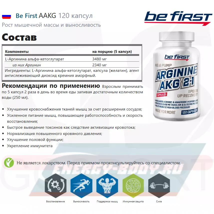 Be First AAKG (Arginine AKG) Capsules содержит 2 молекулы аргинина, связанные с 1 молекулой альфа-кетоглутарата в идеальном соотношении 2:1. Продукт разработан при участии специалистов мирового уровня в области спортивного питания и произведен в соответствии с мировыми стандартами качества на предприятии, обладающем международными сертификатами ISO и HACCP. Благодаря профессионально составленной рецептуре и использованию высококачественного сырья Be First AAKG 2:1 обладает максимальной эффективностью и наилучшей степенью усвоения организмом.