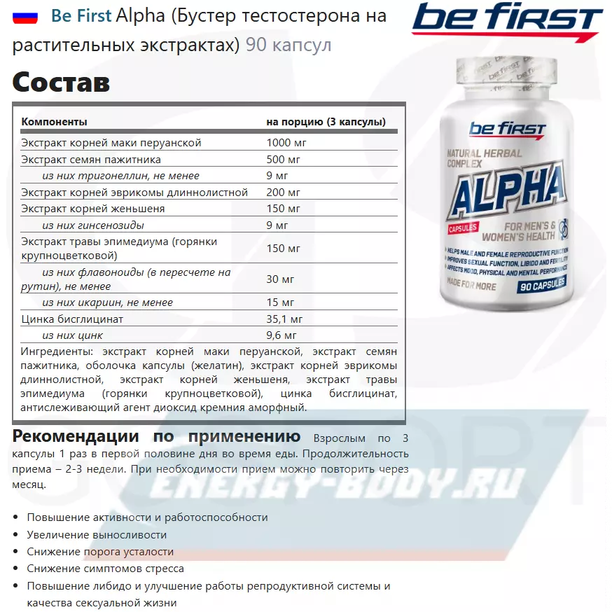 Состав Be First Alpha (Бустер тестостерона на растительных экстрактах)