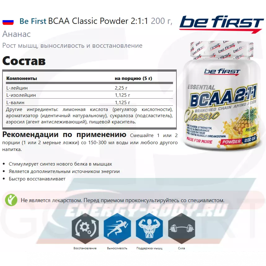 Добавка с BCAA в традиционном соотношении 2:1:1 – это полное соответствие природному соотношению этих аминокислот в составе белков. Если посмотреть на образцовые белки (сывороточный, яичный и т.п.), то соотношение лейцина к изолейцину и валину в них будет очень близким к данному. Именно так их проще всего выделить и именно так они лучше всего усваиваются организмом. Поэтому Be First BCAA 2:1:1 CLASSIC Powder – это многократно испытанная классика! BCAA с такой рецептурой применяются тысячами спортсменов по всему миру уже давно и успешно помогают им добиваться поставленных целей, наращивая мышечную массу и силовые показатели, быстро восстанавливаясь и возвращаясь к тренировкам.