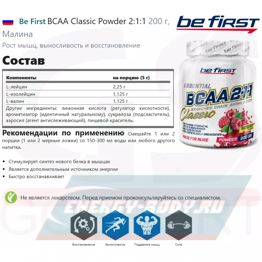 Добавка с BCAA в традиционном соотношении 2:1:1 – это полное соответствие природному соотношению этих аминокислот в составе белков. Если посмотреть на образцовые белки (сывороточный, яичный и т.п.), то соотношение лейцина к изолейцину и валину в них будет очень близким к данному. Именно так их проще всего выделить и именно так они лучше всего усваиваются организмом. Поэтому Be First BCAA 2:1:1 CLASSIC Powder – это многократно испытанная классика! BCAA с такой рецептурой применяются тысячами спортсменов по всему миру уже давно и успешно помогают им добиваться поставленных целей, наращивая мышечную массу и силовые показатели, быстро восстанавливаясь и возвращаясь к тренировкам.